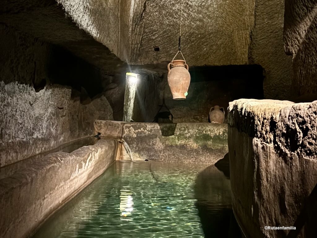 En algunos tramos el recorrido se estrecha y permite observar de cerca una cisterna privada, donde antiguamente el agua se extraía mediante ánforas de terracota sujetas con cuerdas a través de un pozo que conectaba con las viviendas en superficie. Es uno de los momentos más didácticos y sorprendentes del recorrido.