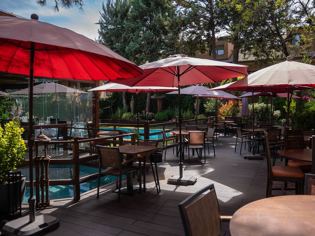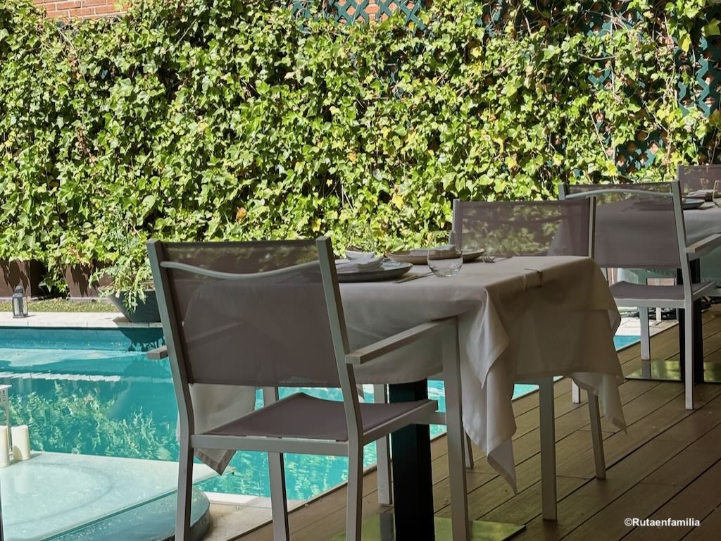 Aunque se encuentra en plena ciudad, su terraza interior con zonas de agua añade ese plus tan buscado en primavera, perfecta para disfrutar de una comida al aire libre en un ambiente elegante y relajado.